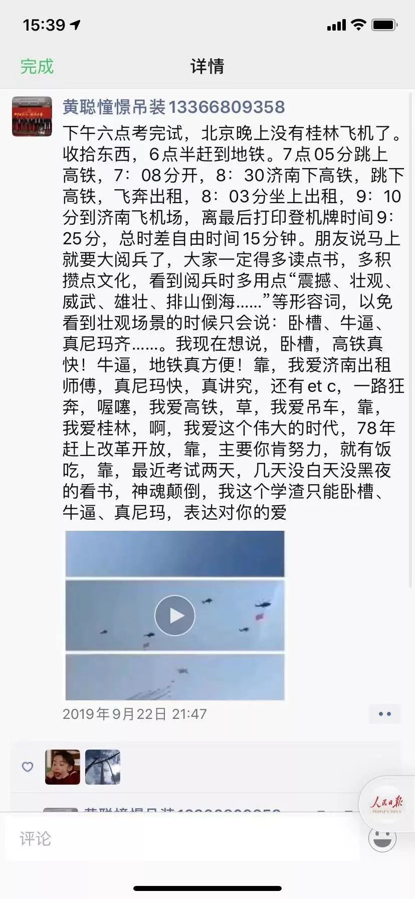 前些天,黃聰在微信朋友圈開(kāi)玩笑說(shuō):“馬上就要大閱兵了,大家一定得多讀點(diǎn)書,看到閱兵時(shí)多用點(diǎn)震撼、壯觀、威武等形容詞,以免到時(shí)只會(huì)說(shuō)哇塞、牛逼、好看......”。這位講著一口廣東普通話70后吊裝老板,為人風(fēng)趣而低調(diào)。
