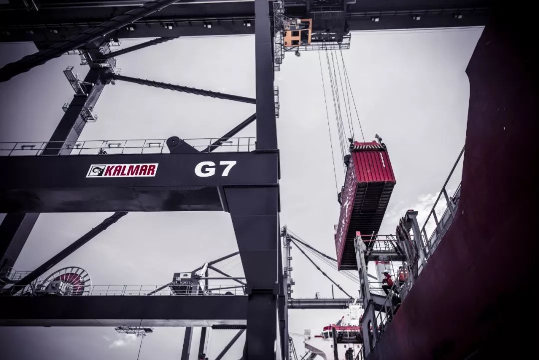 卡爾瑪特超巴拿馬岸橋起重機(jī)探輻可達(dá)21排集裝箱,具備雙吊能力,起重能力可達(dá)65噸。