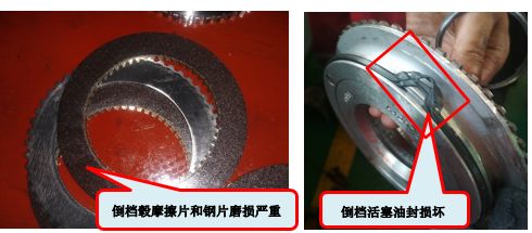 將變速箱油排出到干凈的油桶,發(fā)現(xiàn)放出的變速箱油上有很多黑色的粉末,可以判斷變速箱內(nèi)部檔轂?zāi)p。 進(jìn)一步吊下變速箱,拆解后發(fā)現(xiàn)倒檔轂內(nèi)磨擦片磨損嚴(yán)重,間隙過大,倒檔活塞都脫出,活塞油封損壞。