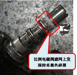 為了排除控制系統(tǒng)因素,先檢查變速箱控制閥上的檔位電磁閥。拆下電磁閥發(fā)現(xiàn)在比例電磁閥的濾網(wǎng)上有黑色碎屑,疑似變速箱內(nèi)部檔轂?zāi)Σ疗牧稀?/p>