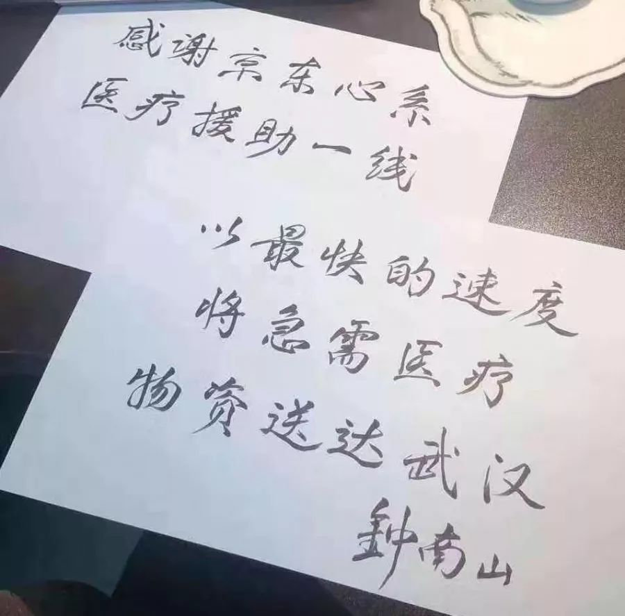 ▲鐘南山院士題詞2月2日上午11時,一輛載有100臺制氧機的京東物流車,順利運抵武漢漢口醫(yī)院。這批100臺制氧機是由廣州醫(yī)科大學(xué)附屬第一醫(yī)院廣州呼吸健康研究院鐘南山院士團隊,通過廣東省鐘南山醫(yī)學(xué)基金會捐贈給武漢漢口醫(yī)院的。這批緊急醫(yī)療物資對于保障廣東醫(yī)療隊接管的武漢漢口醫(yī)院病區(qū)很多病人的生命安全至關(guān)重要!早到一分鐘,就多一分生命的希望!