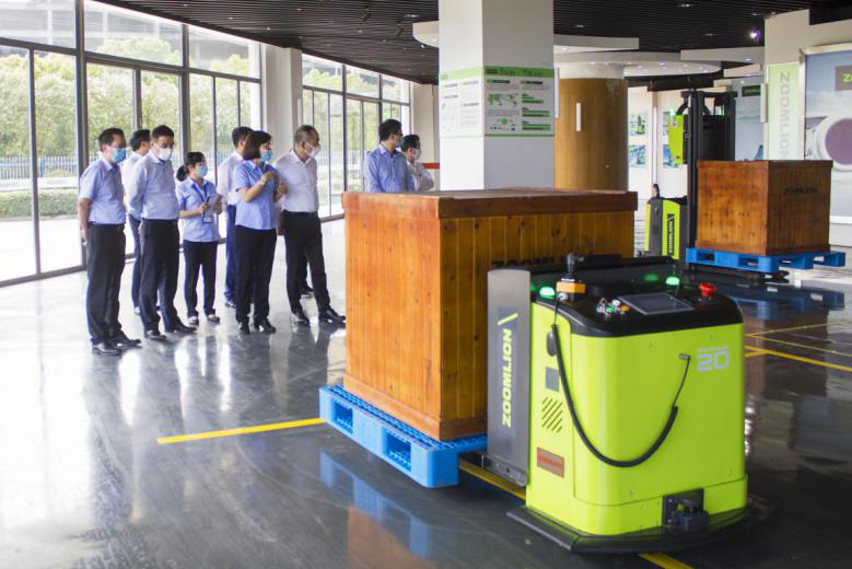 視察首站,董事長一行來到了AGV展廳,伴隨著激光導(dǎo)航堆高車和磁導(dǎo)航托盤車的運(yùn)行,總經(jīng)理助理彭瓊梅向董事長詳細(xì)介紹了公司各類AGV產(chǎn)品。通過觀看工業(yè)車輛公司智能物流設(shè)備在各兄弟事業(yè)部實施案例的視頻,彭總向董事長介紹了高空作業(yè)機(jī)械事業(yè)部、常德液壓事業(yè)部以及工程起重機(jī)(白俄)工廠項目的AGV使用及進(jìn)展情況。董事長仔細(xì)聽取了介紹,詢問了目前項目團(tuán)隊的建設(shè)情況,對工業(yè)車輛公司智能物流設(shè)備的開發(fā)與運(yùn)用給予了肯定。