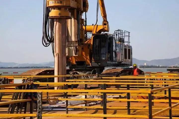 2019年,牛田洋特大橋主塔墩23號(hào)墩首樁永久鋼護(hù)筒順利插打到位,標(biāo)志著該橋正式進(jìn)入主體工程施工階段。該樁基鉆孔采用徐工XR550D旋挖鉆機(jī)進(jìn)行施工,整個(gè)鉆進(jìn)周期僅為11天,為保證鉆孔樁按期完成澆筑提供了強(qiáng)力保證。
