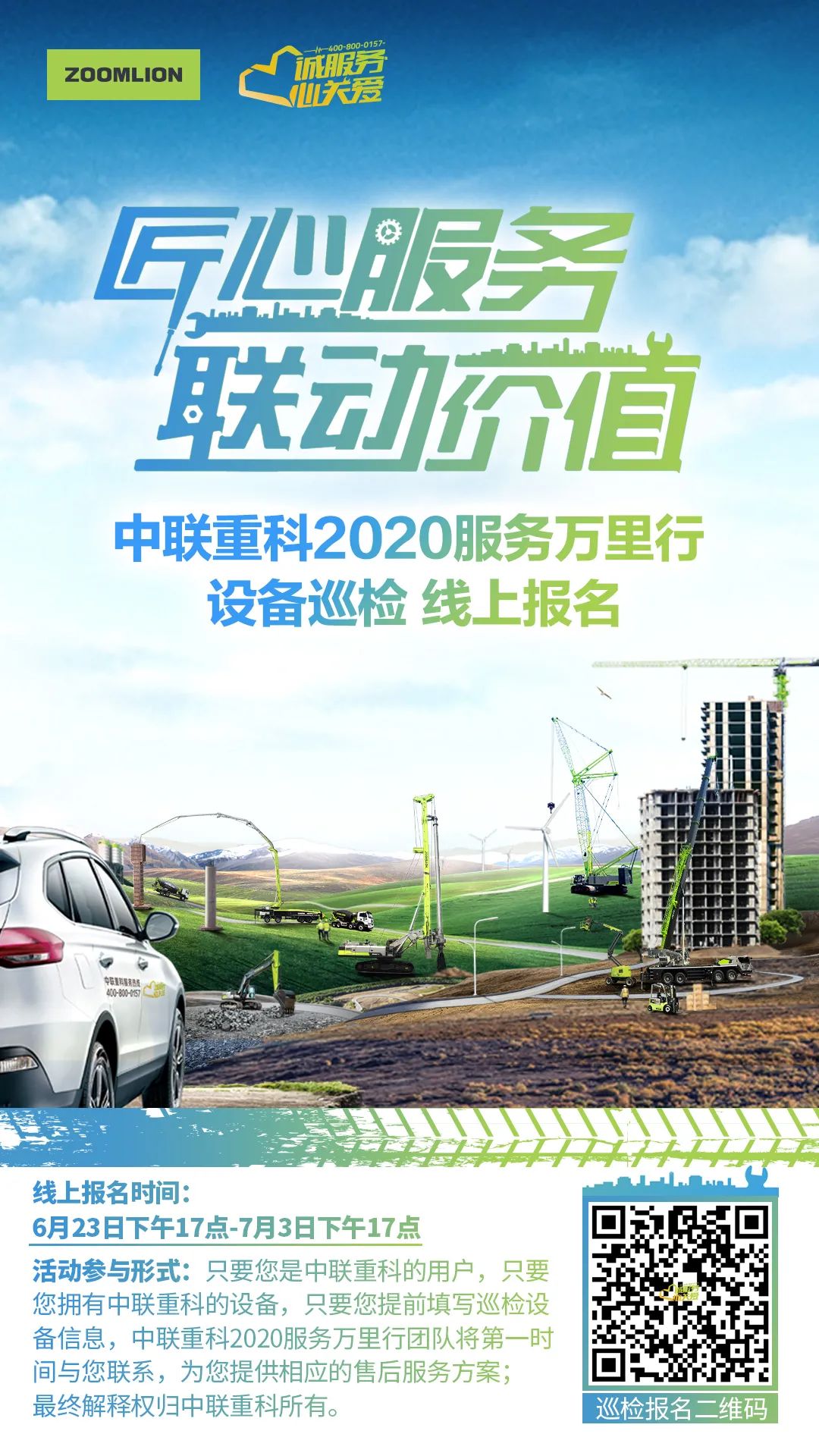 只要您是中聯(lián)重科的用戶,只要您擁有中聯(lián)重科的設(shè)備,只要您提前報名填寫巡檢設(shè)備信息,中聯(lián)重科2020服務(wù)萬里行團(tuán)隊將第一時間與您聯(lián)系,為您提供相應(yīng)的售后服務(wù)方案(最終解釋權(quán)歸中聯(lián)重科所有)。
