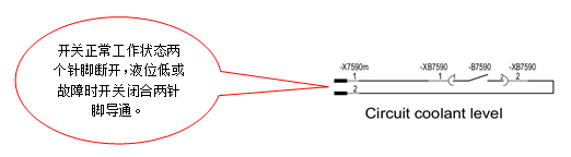 進一步檢查機車各水管,發(fā)現(xiàn)暖風(fēng)管接頭滲水。緊固水管接頭之后擦除水漬,并按要求添加專用冷卻液(Volvo VCS黃標冷卻液配件編號:J00597.0100),試車發(fā)現(xiàn)故障依然存在。進一步檢查測量機車冷卻液液位傳感器,發(fā)現(xiàn)液位傳感器兩個針腳常通。依據(jù)機車電氣原理圖,當冷卻液液位正常時此開關(guān)斷開,當冷卻液液位過低時此開關(guān)閉合,并向Volvo發(fā)動機控制單元(D7940)發(fā)送一個24VDC信號。