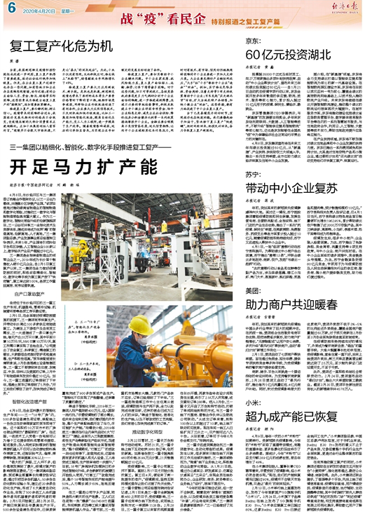 4月20日,《經(jīng)濟(jì)日報》刊文提到,三一集團(tuán)是全球裝備制造業(yè)的領(lǐng)軍企業(yè)之一,2019年成為長沙首個銷售收入破千億元企業(yè),自2月5日復(fù)工復(fù)產(chǎn)以來,三一集團(tuán)積極采取精細(xì)化、智能化、數(shù)字化等手段為復(fù)工復(fù)產(chǎn)按下“快進(jìn)鍵”,復(fù)工率達(dá)到100%,各項工作重回高效、有序運(yùn)營軌道。