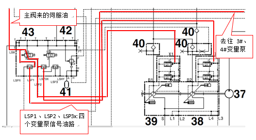 考慮到大臂起升和大臂伸出都需要4個(gè)變量柱塞泵同時(shí)工作(該機(jī)型配置4個(gè)變量柱塞泵),隨后啟動(dòng)機(jī)車(chē),測(cè)試大臂伸出動(dòng)作,發(fā)現(xiàn)大臂伸出動(dòng)作也較緩慢,初步判斷4個(gè)變量泵工作異常。變量泵工作異常,可能為泵內(nèi)部問(wèn)題或變量泵信號(hào)油路異常。