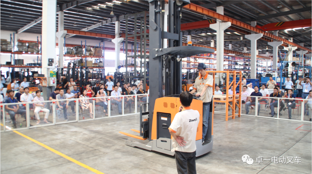 當(dāng)天下午,與會(huì)人員又趨車(chē)來(lái)到卓一智能叉車(chē)工廠,與卓一窄通道智能叉車(chē)系列產(chǎn)品進(jìn)行了零距離的接觸。雖然夏日驕陽(yáng)似火,但參會(huì)人員對(duì)卓一窄通道系列產(chǎn)熱力不減。下午的活動(dòng)在三位卓一智能叉車(chē)技術(shù)項(xiàng)目負(fù)責(zé)人的產(chǎn)品解說(shuō)與演示中熱鬧上演。在密集存儲(chǔ)貨架區(qū)的現(xiàn)場(chǎng)實(shí)景,只見(jiàn)三向車(chē)、全向車(chē)、和雙深位前移式叉車(chē)游刃有余地穿梭其中,完成一次又一次的精準(zhǔn)作業(yè)演示,得到了大家一致認(rèn)可。而壓軸出場(chǎng)的AGV無(wú)人駕駛叉車(chē)不僅在外觀上亮麗挺拔,更在物流作業(yè)上大展身手。它高效地完成了定點(diǎn)作業(yè)、堆高操作、精作入叉、滾筒線接駁等既定動(dòng)作,受到了大家的青睞。解說(shuō)演示結(jié)束,自由洽談環(huán)節(jié)更讓卓一智能叉車(chē)的工廠猶如火熱的天氣一般,大家三五成群,在卓一技術(shù)、銷(xiāo)售、管理人員的陪同下,進(jìn)行了更深一層的交流,很多參會(huì)代表表達(dá)了后續(xù)合作的意向,為這次卓一窄通道智能裝備技術(shù)交流會(huì)劃下了一個(gè)圓滿的句號(hào)。