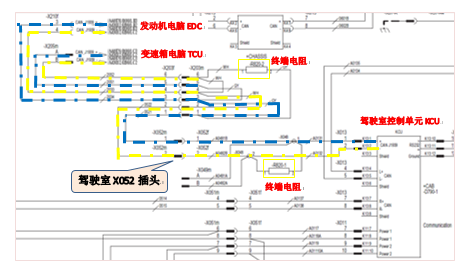 根據(jù)機(jī)車電氣原理圖,檢查KCU到發(fā)動(dòng)機(jī)和變速箱控制單元之間通訊線路,如下: