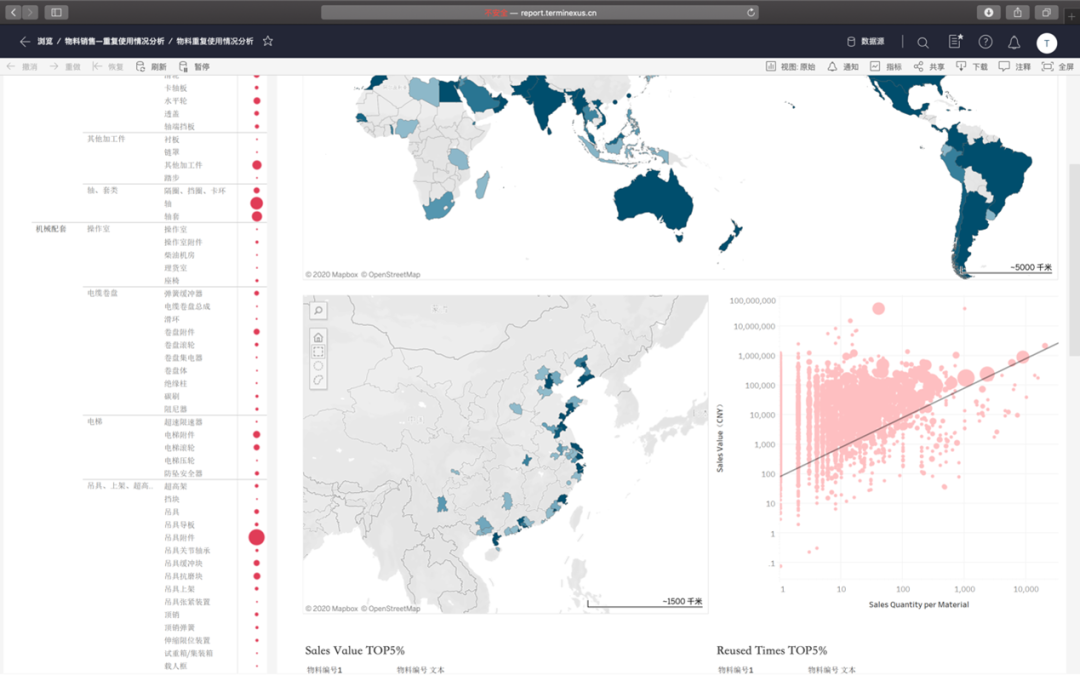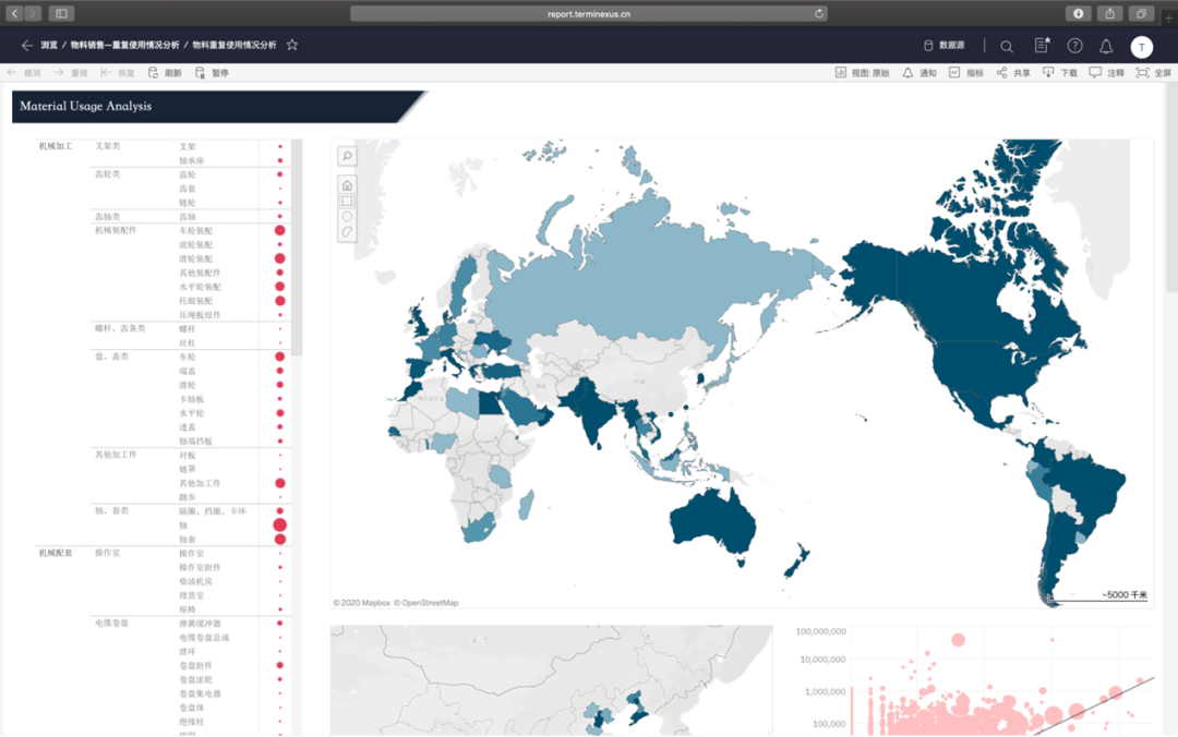 Terminexus的IDAS智能數(shù)據(jù)分析平臺,同時(shí)也是一個備件主數(shù)據(jù)平臺,可以顯示同一型號備件在全球的熱力圖。