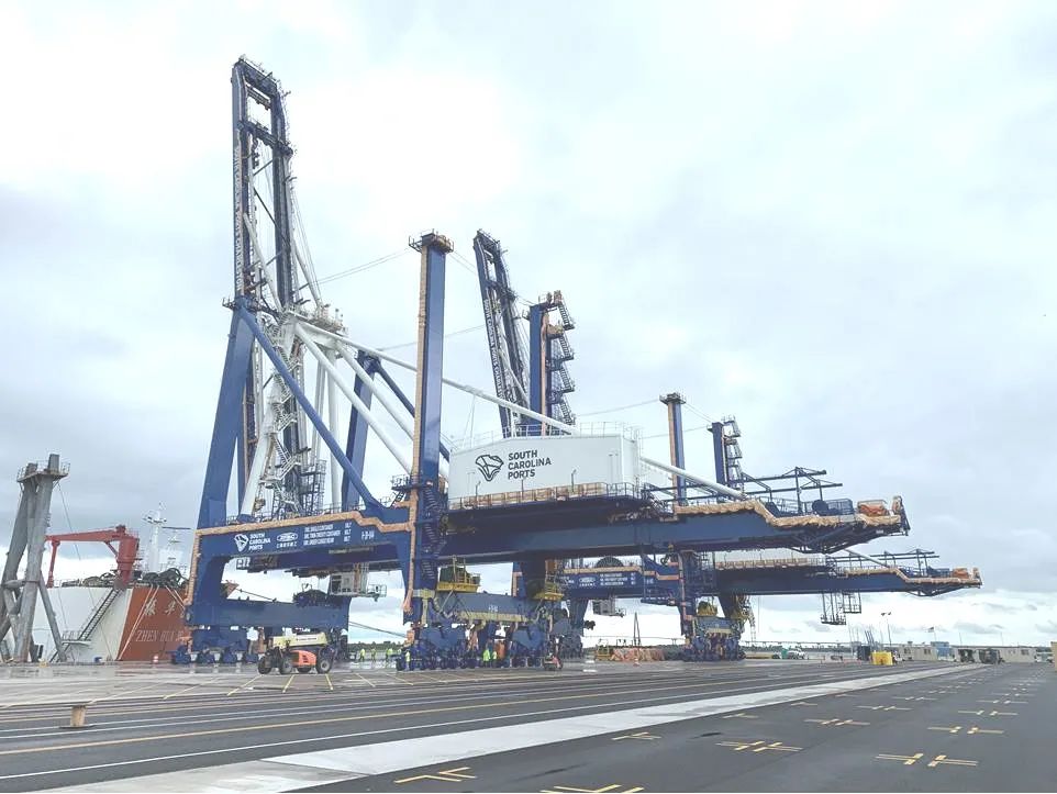 11月1日,美國南卡HLT碼頭第一批2臺岸橋的卸船工作順利完成,進入調試階段。