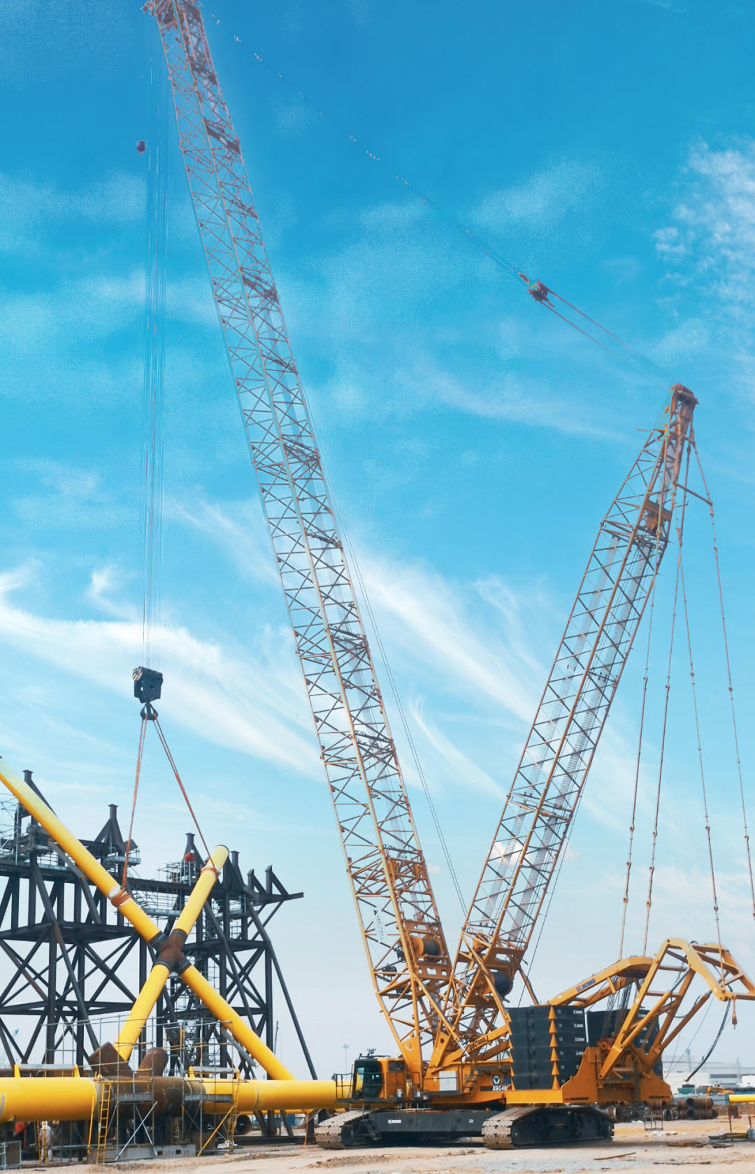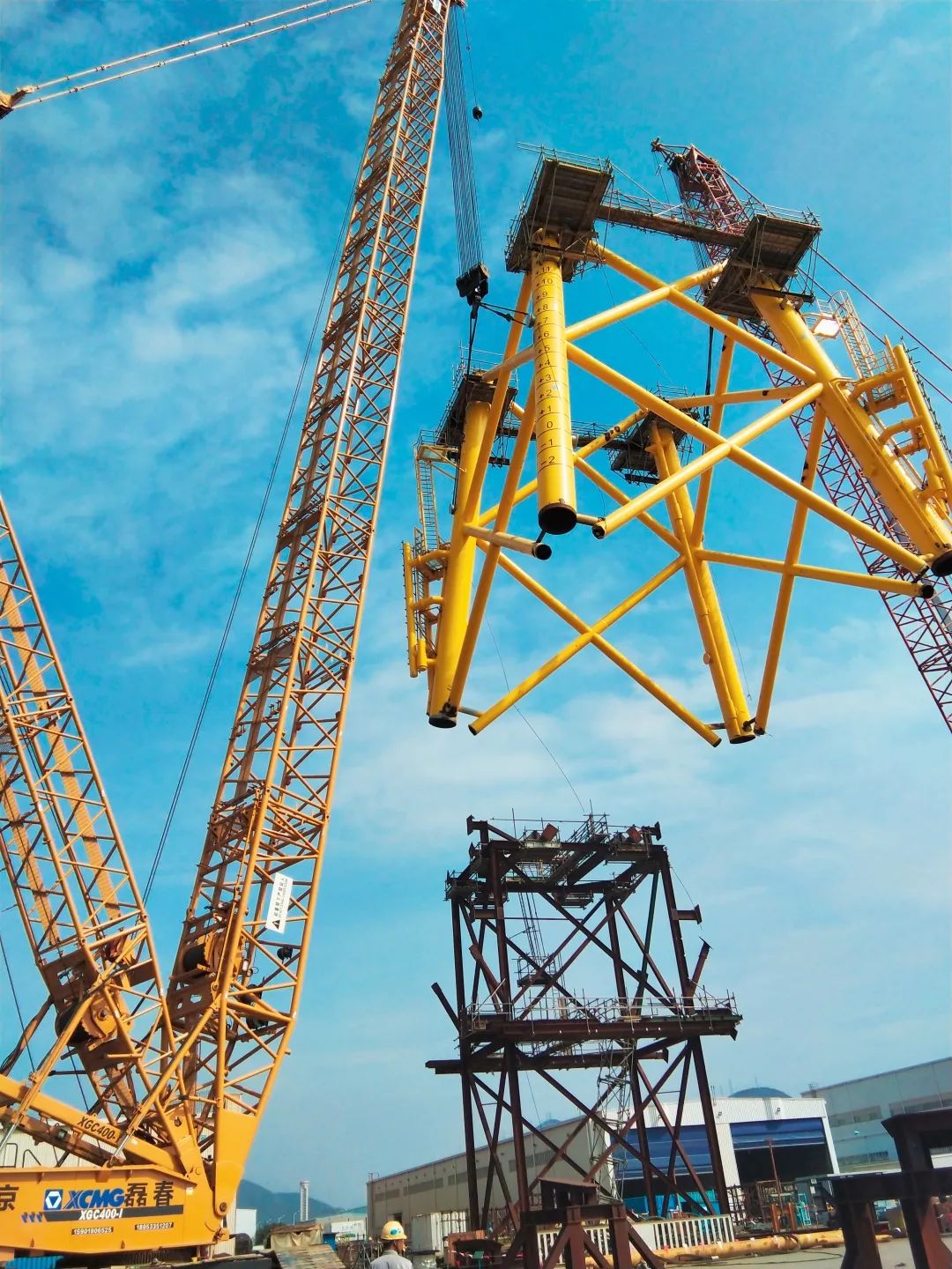 近日,在珠海巨濤石油海上平臺加工基地,徐工XGC400-I履帶起重機采用66米超起重型主臂工況,工作幅度25米,完成多臺海上風電導管架部件的吊裝任務。