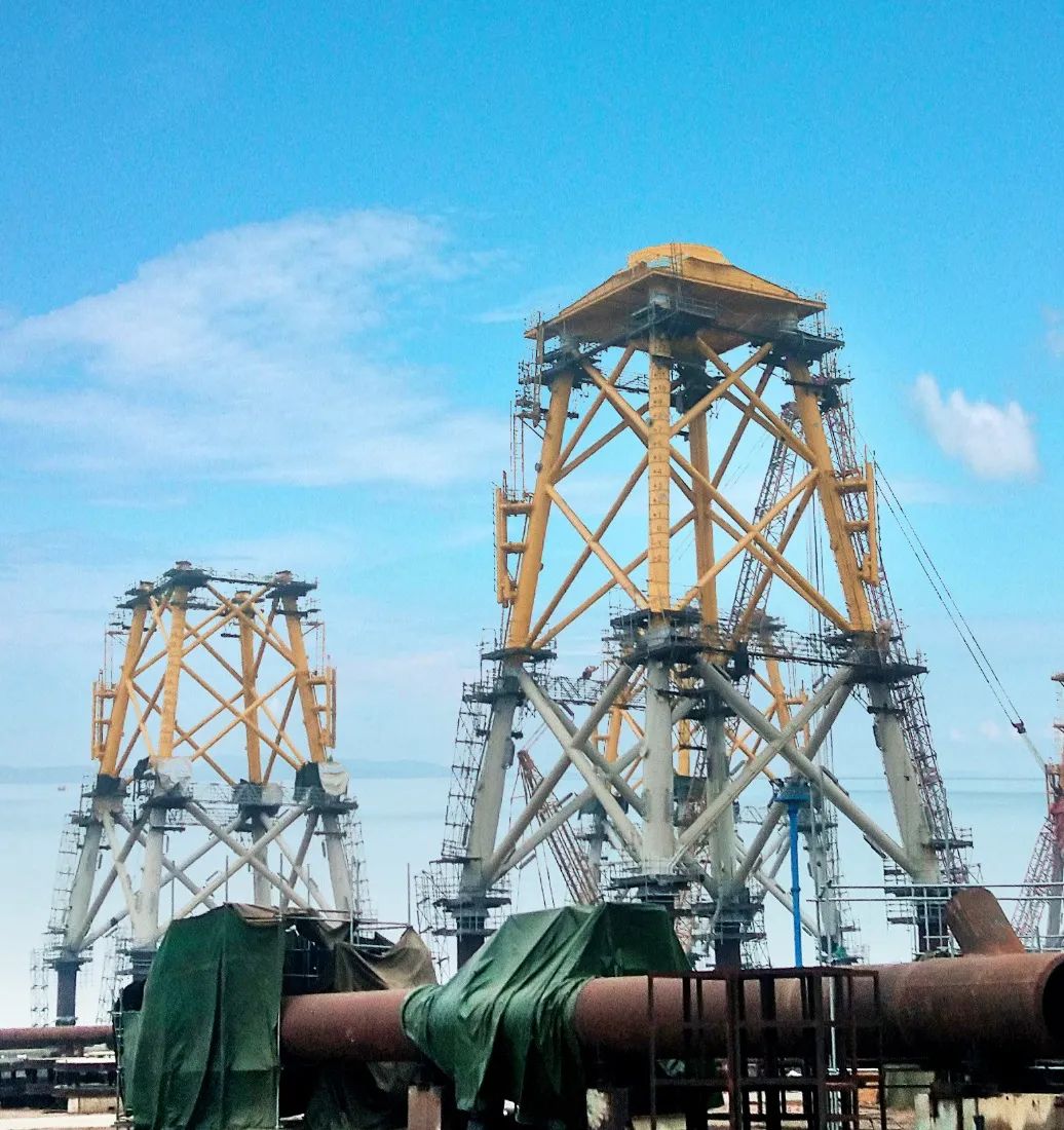 風機基礎(chǔ)導管架是海上風機塔筒與水下樁基的連接段,由導管架主體結(jié)構(gòu)和過渡段組成,主要應用于單機容量較大、水深較深、地質(zhì)條件較差的海上風電場。拼裝完成后,該項目單體導管架重700噸,將被吊裝到海上施工船上準備水下固定工作,為海上風機的后續(xù)安裝打下堅實的基礎(chǔ)。