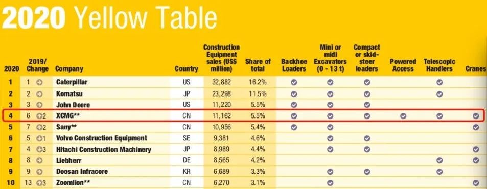 實(shí)際上,“2020年躋身世界前五”的目標(biāo)已經(jīng)提前實(shí)現(xiàn)了。根據(jù)全球最具權(quán)威的工程機(jī)械信息提供商英國(guó)KHL集團(tuán)發(fā)布的“2020年全球工程機(jī)械制造商50強(qiáng)排行榜(2020Yellow Table)”,徐工世界排名已由2019年的第六位躍升至2020年的第四位。