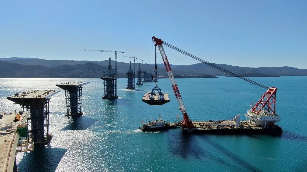 克羅地亞佩列沙茨大橋是中克兩國(guó)之間規(guī)模最大的基建項(xiàng)目,也是克羅地亞建國(guó)以來(lái)的重點(diǎn)民生項(xiàng)目,連接克羅地亞本土與佩列沙茨半島。大橋?yàn)榱撓淞盒崩瓨?,全長(zhǎng)2440米,振華重工承接了該項(xiàng)目165個(gè)鋼箱梁中的84個(gè)鋼箱梁分段制造。