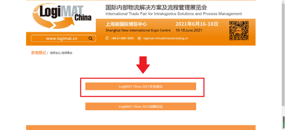 ③ 點(diǎn)擊LogiMAT China 2021專業(yè)觀眾進(jìn)入注冊流程,若您只對同期論壇感興趣可點(diǎn)擊“同期論壇”選項(xiàng)。