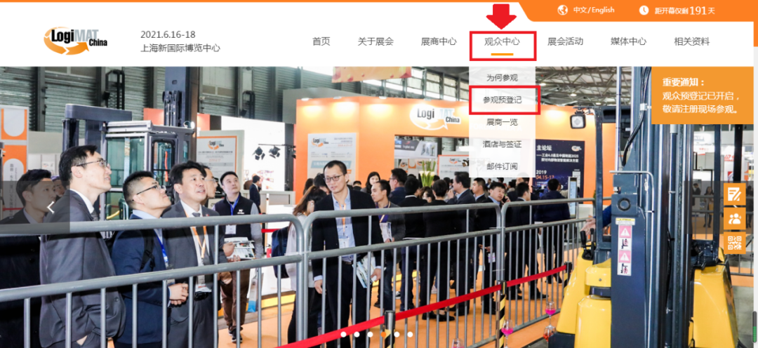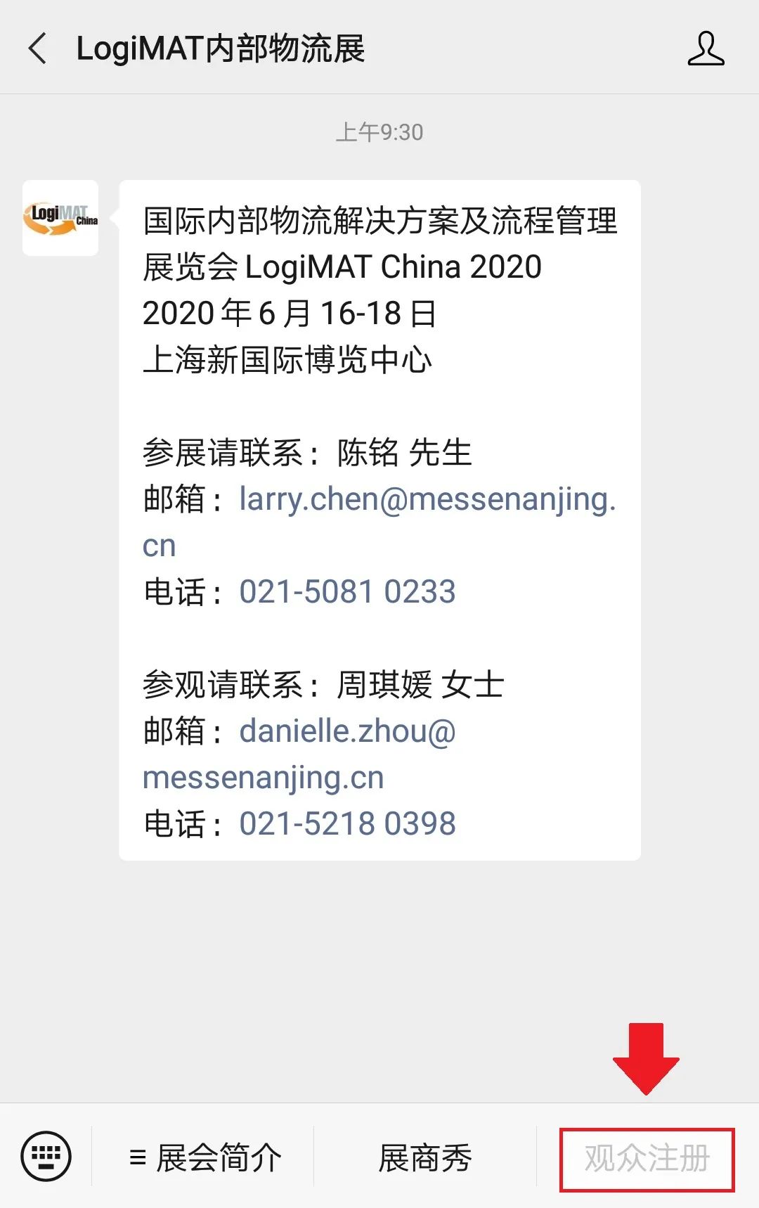 Step 1: 關(guān)注公眾號“LogiMAT內(nèi)部物流展”,點(diǎn)擊右下方“觀眾注冊。
