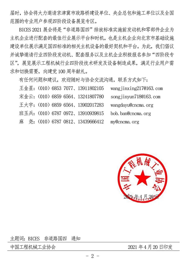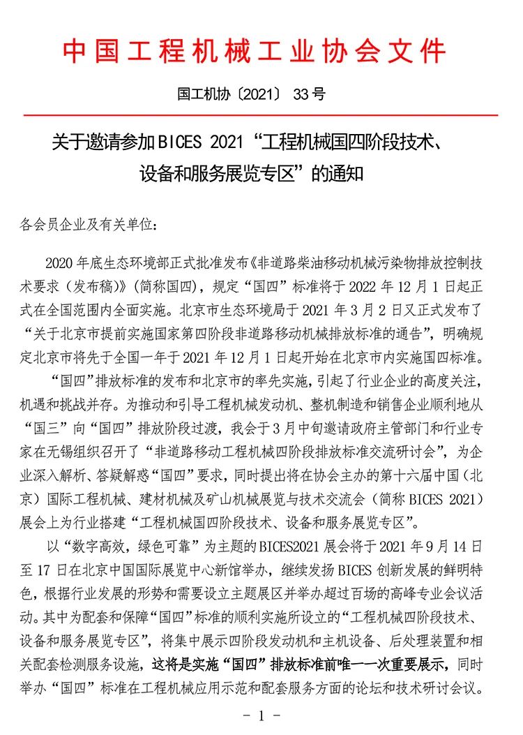 關(guān)于邀請(qǐng)參加BICES 2021“工程機(jī)械國(guó)四階段技術(shù)、設(shè)備和服務(wù)展覽專區(qū)”的通知