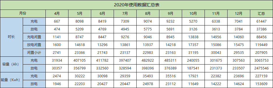 2020年全體電池充電放電容量、能量和時(shí)長(zhǎng)數(shù)據(jù)匯總?cè)缦?/strong>