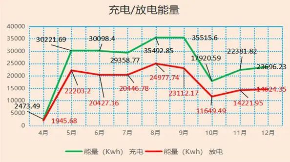 1、全年累計(jì)能量(充電227159.45Kwh/放電153608.52Kwh),其各月情況: