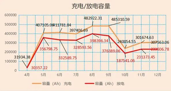 2、全年累計(jì)容量(充電3065753Ah/放電2475546Ah),其各月情況: