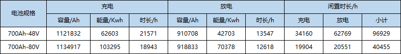 (1)對(duì)建議減少電池的2種規(guī)格電池(其中:700Ah-48V電池26組,700Ah-80V電池14組)進(jìn)一步分析,結(jié)果方案可行。其數(shù)據(jù)見下表: