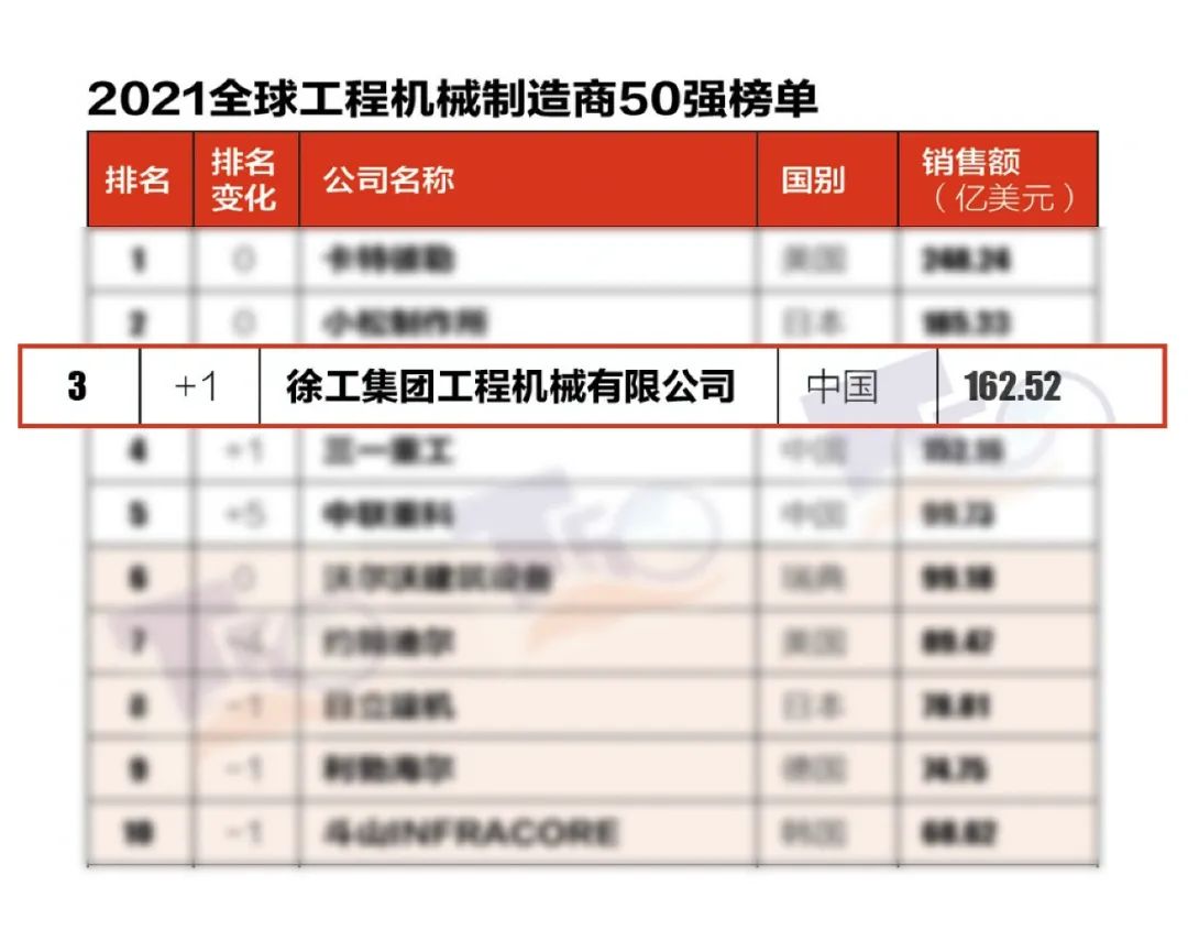 近日,“2021全球工程機(jī)械制造商50強(qiáng)”榜單在京發(fā)布,徐工進(jìn)入全球前三甲,這也是中國(guó)品牌首度挺進(jìn)前三。