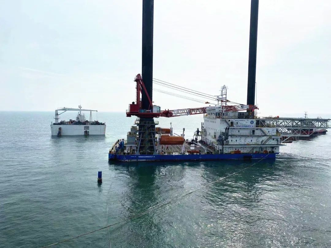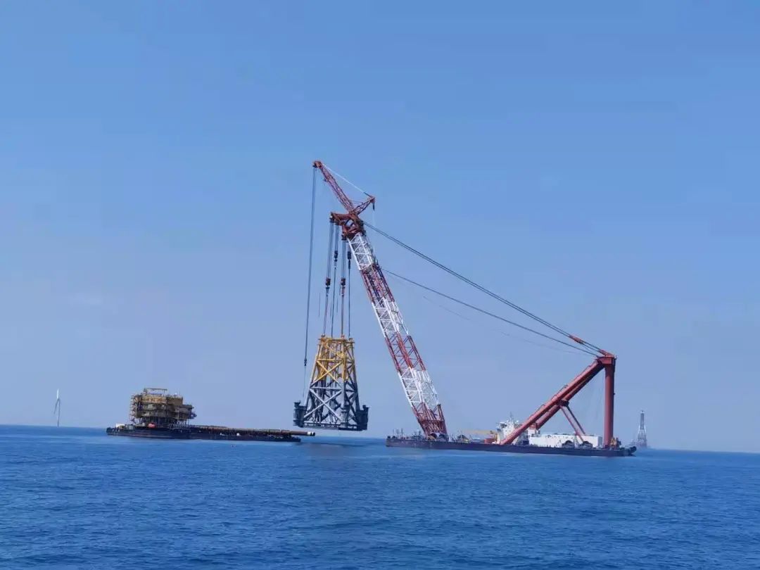 5月7日,“新振浮7”輪進入施工水域拋錨駐位?,F(xiàn)場項目團隊克服運輸船舶空間狹小,施工海域水流急、涌浪大,吊裝高度到達極限等困難,經(jīng)過48小時連續(xù)奮戰(zhàn),順利將導(dǎo)管架精準(zhǔn)安裝。
