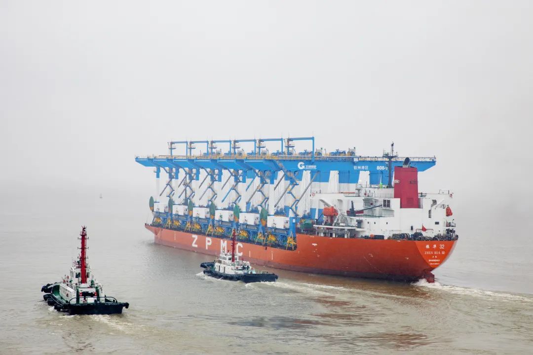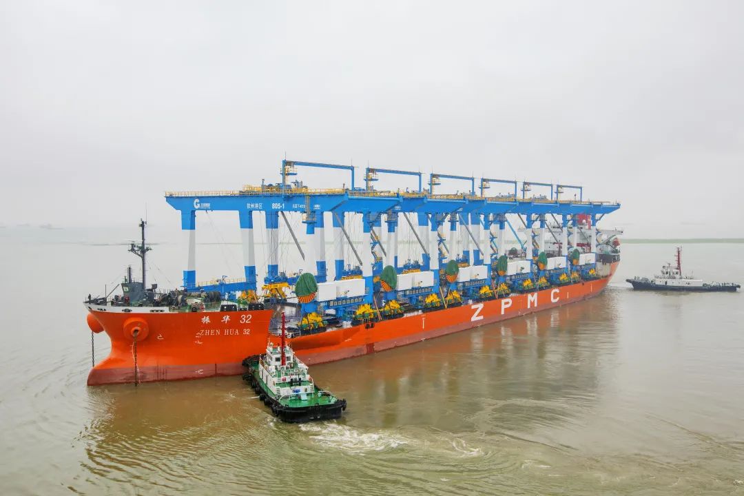 5月23日,伴隨著蒙蒙細雨,“振華32”輪裝載著廣西北部灣欽州港自動化碼頭項目首批6臺自動化軌道吊順利駛離振華重工南通分公司,前往廣西。