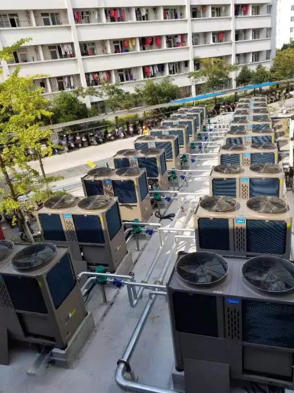 長(zhǎng)興分公司對(duì)1號(hào)、3號(hào)職工生活區(qū)的生活熱水供應(yīng)進(jìn)行改造,主要以53臺(tái)空氣源熱泵和2臺(tái)電加熱開水爐替代原有的12臺(tái)燃油鍋爐和2臺(tái)燃油開水爐,保留原有熱水水箱,在室外新增空氣源熱泵及其配套管路、水泵、閥件等。由于空氣源熱泵機(jī)組特性,在原有水箱基礎(chǔ)上增加新的水箱,增加后的水箱總?cè)萘繉M足每日高峰用水量需求。實(shí)際運(yùn)行后的統(tǒng)計(jì)數(shù)據(jù)顯示,改造后年節(jié)能可達(dá)410噸標(biāo)煤,同時(shí)避免了鍋爐燃燒產(chǎn)生的二氧化硫、氮氧化合物等大氣污染物排放和噪音污染。