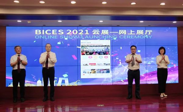 最后,協(xié)會秘書長兼展覽公司董事長吳培國、協(xié)會副秘書長兼展覽公司總經(jīng)理呂瑩、信息院產(chǎn)業(yè)所所長田付新、展覽公司副總經(jīng)理夏韋共同開啟“BICES 2021云展”上線。