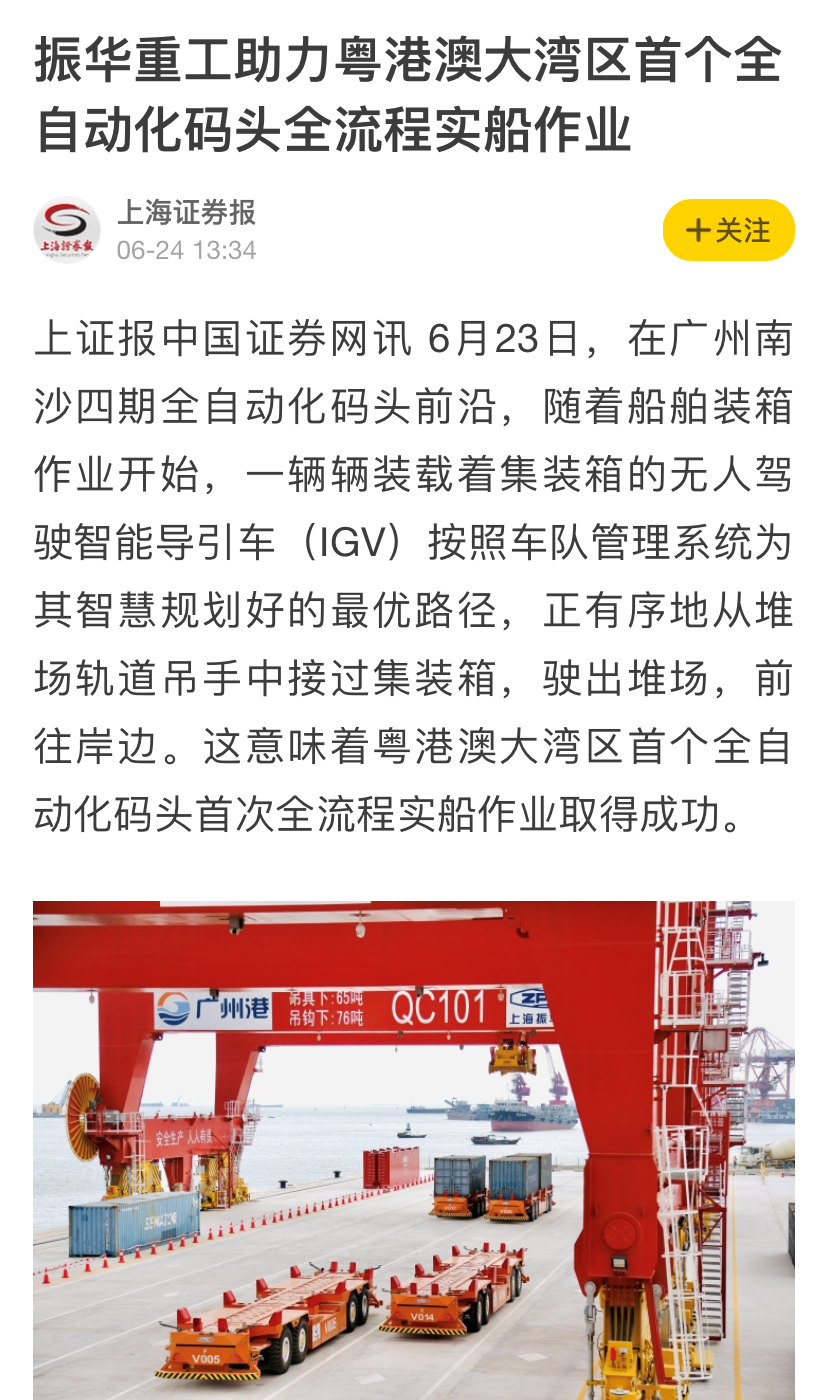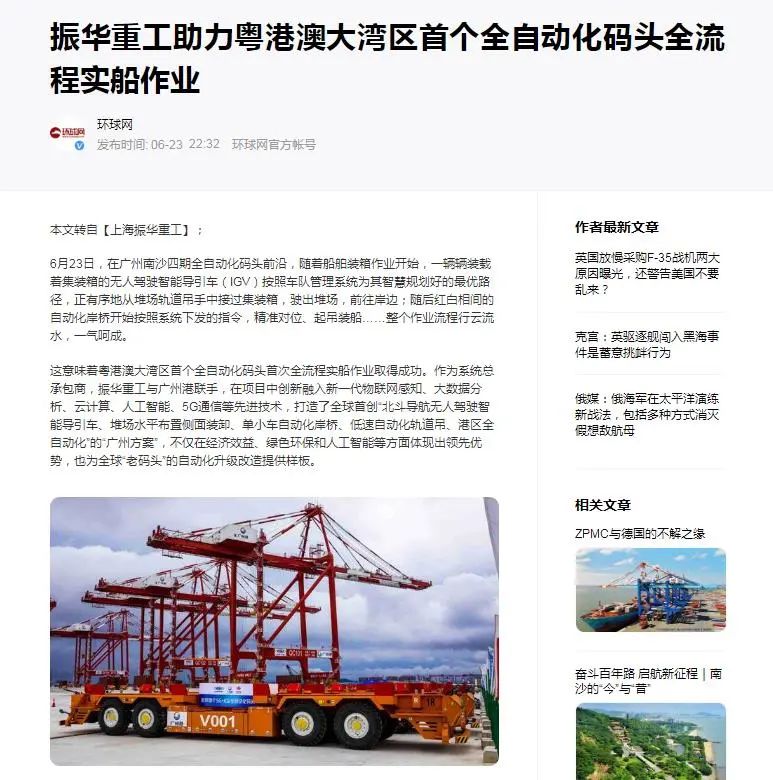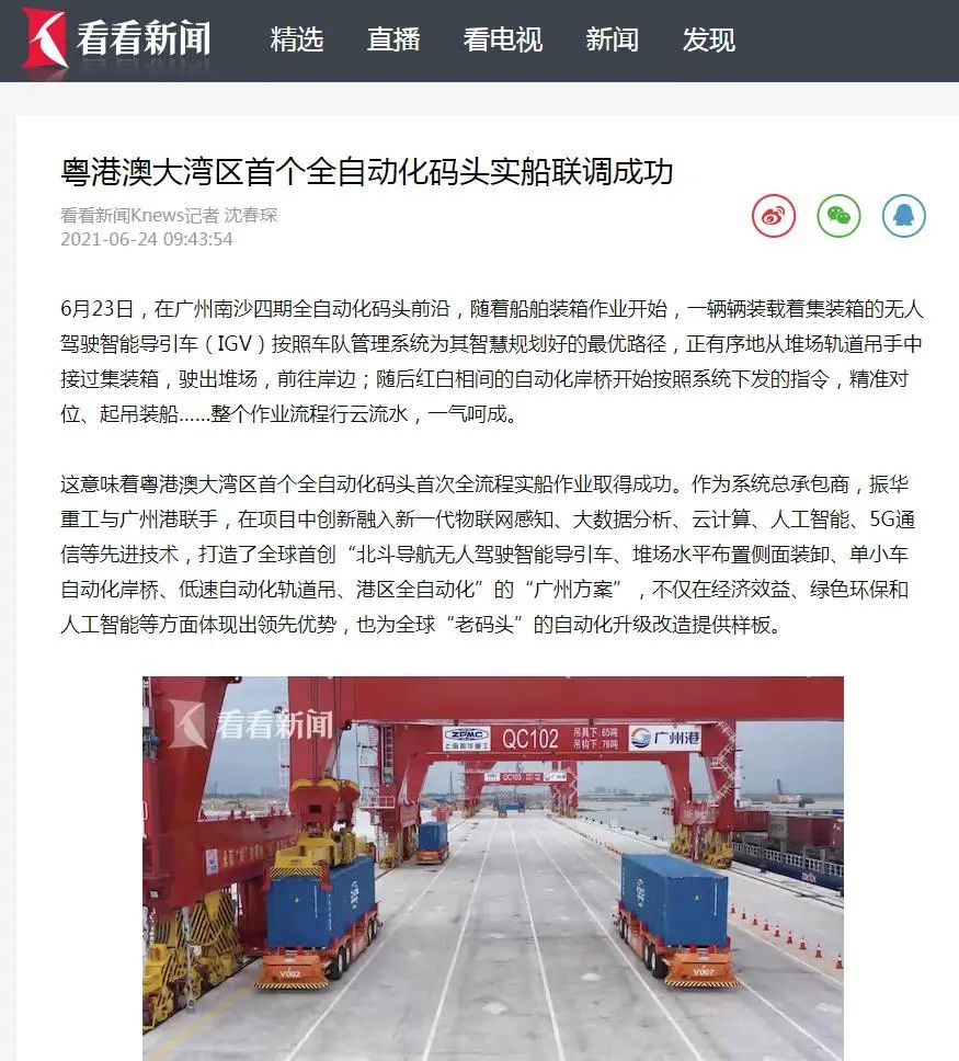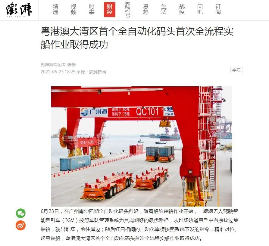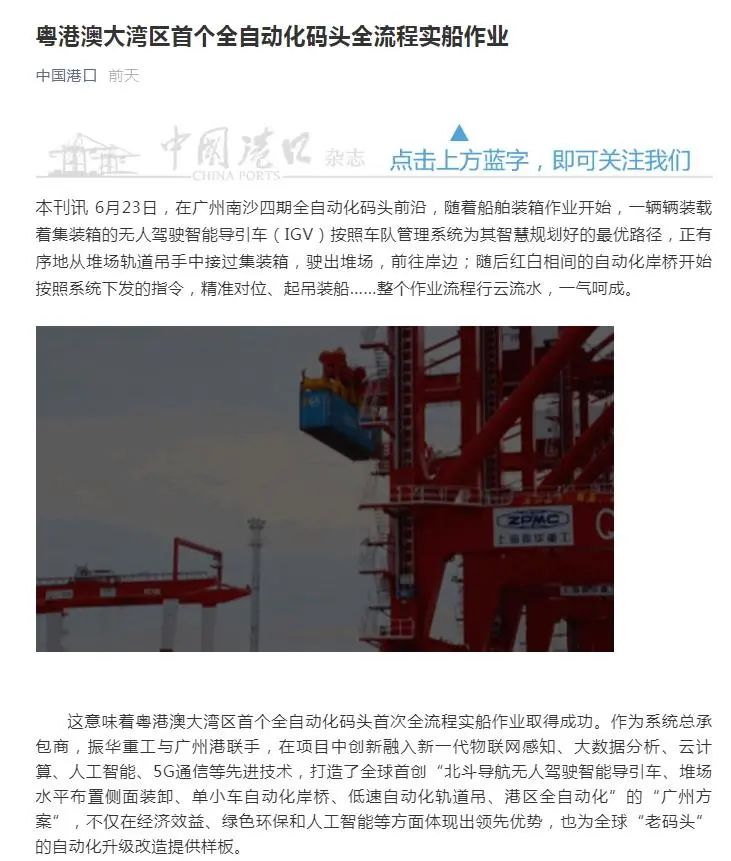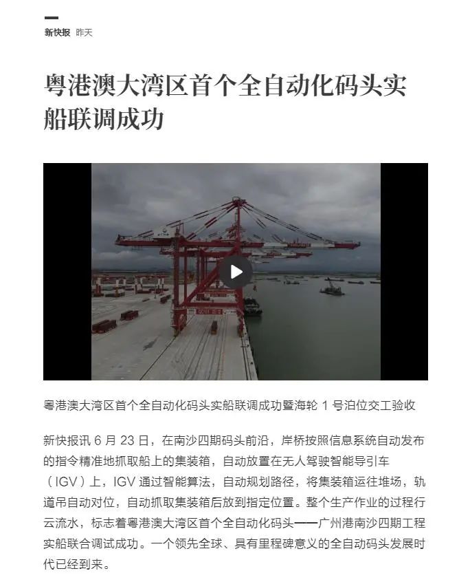 6月23日,廣州南沙四期全自動化碼頭首次全流程實船作業(yè)取得成功,該碼頭也是粵港澳大灣區(qū)首個全自動化碼頭,中央及地方主流媒體紛紛聚焦本次作業(yè)并進行報道?!?..