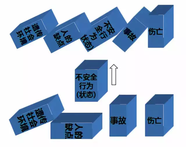海因里希最初提出的事故因果連鎖過程包括如下5個因素:(1)遺傳及社會環(huán)境遺傳因素及環(huán)境是造成人的性格上缺點(diǎn)的原因,遺傳因素可能造成魯莽、固執(zhí)等不良性格;社會環(huán)境可能妨礙教育、助長性格上的缺點(diǎn)發(fā)展。(2)人的缺點(diǎn)人的缺點(diǎn)是使人產(chǎn)生不安全行為或造成機(jī)械、物質(zhì)不安全狀態(tài)的原因,它包括魯莽、固執(zhí)、過激、神經(jīng)質(zhì)、輕率等性格上的先天缺點(diǎn),以及缺乏安全生產(chǎn)知識和技能等后天缺點(diǎn)。(3)人的不安全行為或物的不安全狀態(tài)所謂人的不安全行為或物的不安全狀態(tài)是指那些曾經(jīng)引起過事故,或可能引起事故的人的行為,或機(jī)械、物質(zhì)的狀態(tài),它們是造成事故的直接原因。例如,在起重機(jī)的吊荷下停留、不發(fā)信號就啟動機(jī)器、工作時間打鬧或拆除安全防護(hù)裝置等都屬于人的不安全行為;沒有防護(hù)的傳動齒輪、裸露的帶電體、或照明不良等屬于物的不安全狀態(tài)。(4)事故事故是由于物體、物質(zhì)、人或放射線的作用或反作用,使人員受到傷害或可能受到傷害的、出乎意料之外的、失去控制的事件。墜落、物體打擊等使人員受到傷害的事件是典型的事故。(5)傷害直接由于事故而產(chǎn)生的人身傷害。人們用多米諾骨牌來形象地描述這種事故因果連鎖關(guān)系,得到多米諾骨牌系列。在多米諾骨牌系列中,一顆骨牌被碰倒了,則將發(fā)生連鎖反應(yīng),其余的幾顆骨牌相繼被碰倒。如果移去連鎖中的一顆骨牌,則連鎖被破壞,事故過程被中止。海因里希認(rèn)為,企業(yè)安全工作的中心就是防止人的不安全行為,消除機(jī)械的或物質(zhì)的不安全狀態(tài),中斷事故連鎖的進(jìn)程而避免事故的發(fā)生。