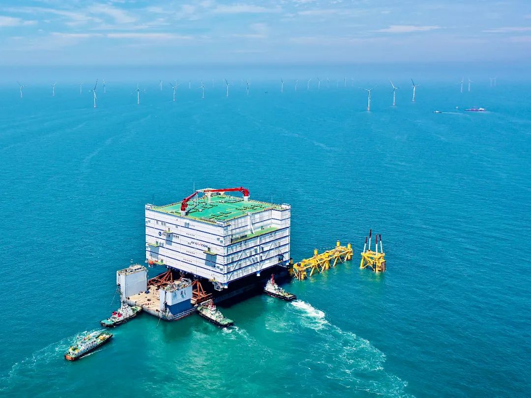 7月18日22時18分,歷經(jīng)17個小時的海上安裝作業(yè),重達2.2萬噸的海上換流站上部模塊與下部導管架成功對接,標志著振華重工承建、三峽集團和中廣核投資的世界最大、亞洲首座海上換流站——如東海上換流站正式完成海上安裝,扎根深海。