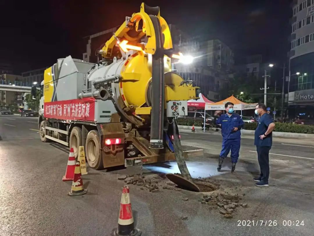 汛情發(fā)生后,徐工緊急組建排澇突擊隊,從公司和經(jīng)銷商處調(diào)集下水道疏通清洗車、挖掘抽吸車、強力吸污車等4臺管網(wǎng)維護及排澇設(shè)備,并派出20余名操作及技術(shù)人員火速趕往前線,于7月22日凌晨順利抵達鄭州,開展救援工作。