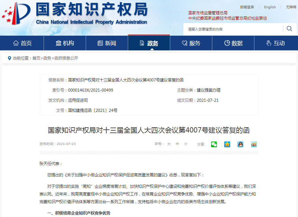 近日,國家知識產(chǎn)權局對這件十三屆全國人大四次會議第4007號建議予以公開回復?;貜椭蟹Q,基于企業(yè)創(chuàng)新發(fā)展需求,積極培育企業(yè)知識產(chǎn)權競爭優(yōu)勢;積極推進快速協(xié)同保護機制建設,著力提升中小企業(yè)知識產(chǎn)權保護能力;推動完善知識產(chǎn)權價值評估體系。下一步,將持續(xù)深化優(yōu)勢示范企業(yè)培育工作,充分發(fā)揮優(yōu)勢示范企業(yè)帶動引領作用;持續(xù)推進知識產(chǎn)權快速協(xié)同保護工作,與地方共同建設知識產(chǎn)權保護中心和快速維權中心;加快推動專利評估指引國家標準制定,進一步完善知識產(chǎn)權運營平臺體系,暢通知識產(chǎn)權交易運營渠道等。