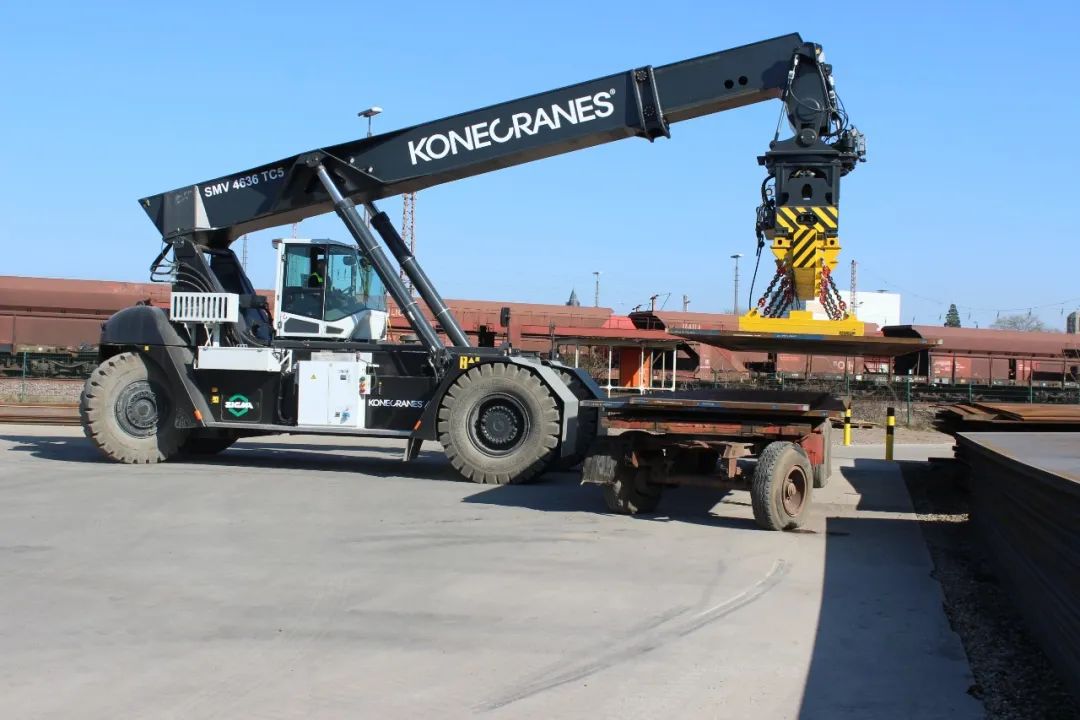 2022年3月科尼向德國享有盛譽(yù)的Sigma Weiterverarbeitungs GmbH & Co KG (Sigma)交付了一臺(tái)SMV 4636 TC5正面吊,車身采用黑色涂裝,配備了帶有四個(gè)磁鐵的的橫梁(由液壓控制),用于鋼板搬運(yùn)作業(yè)。